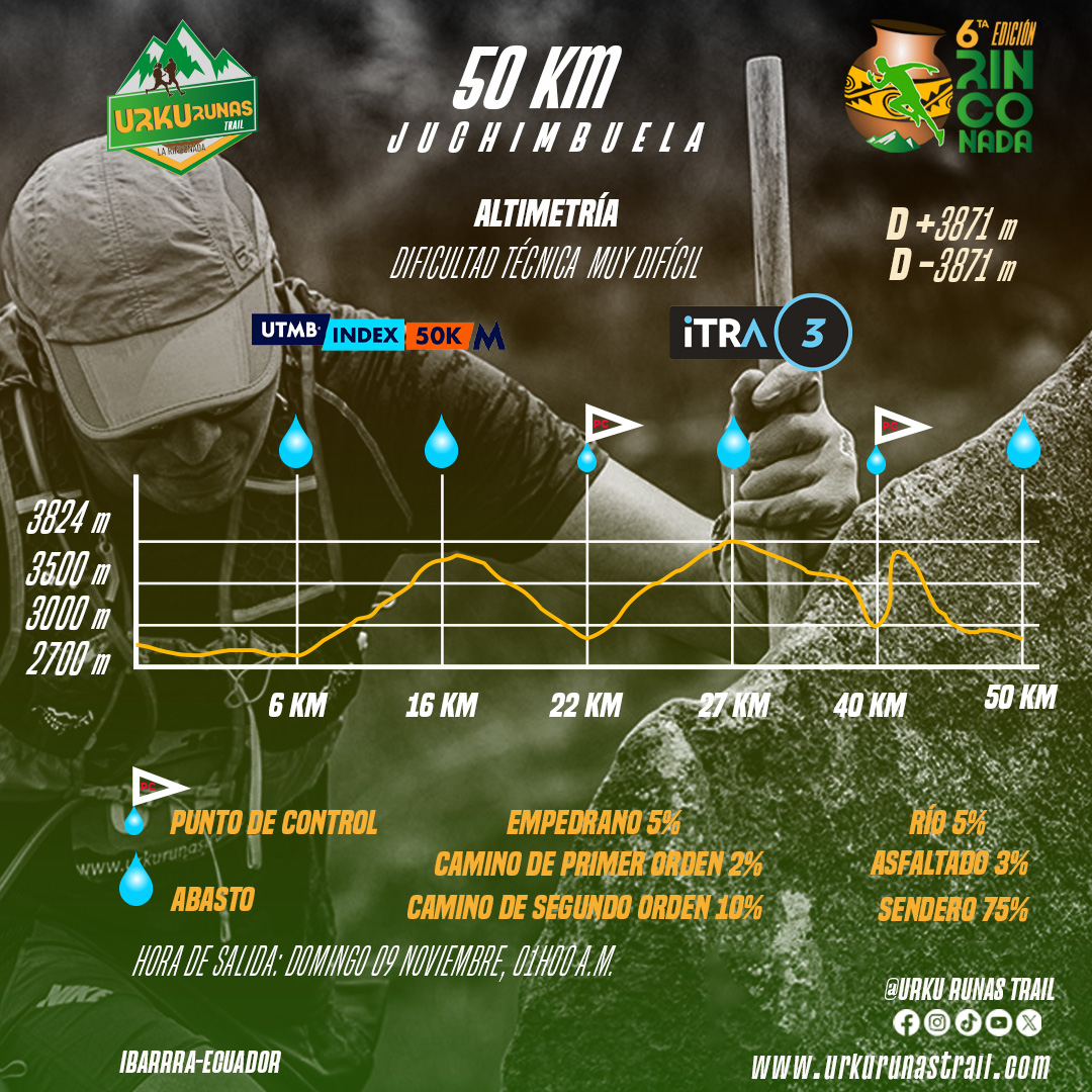 - Puntos de Hidratación: Km 6 - Km 16 Gallo Rumi – Km 22 comida caliente – Km 27 – Km 40 – Km 45
